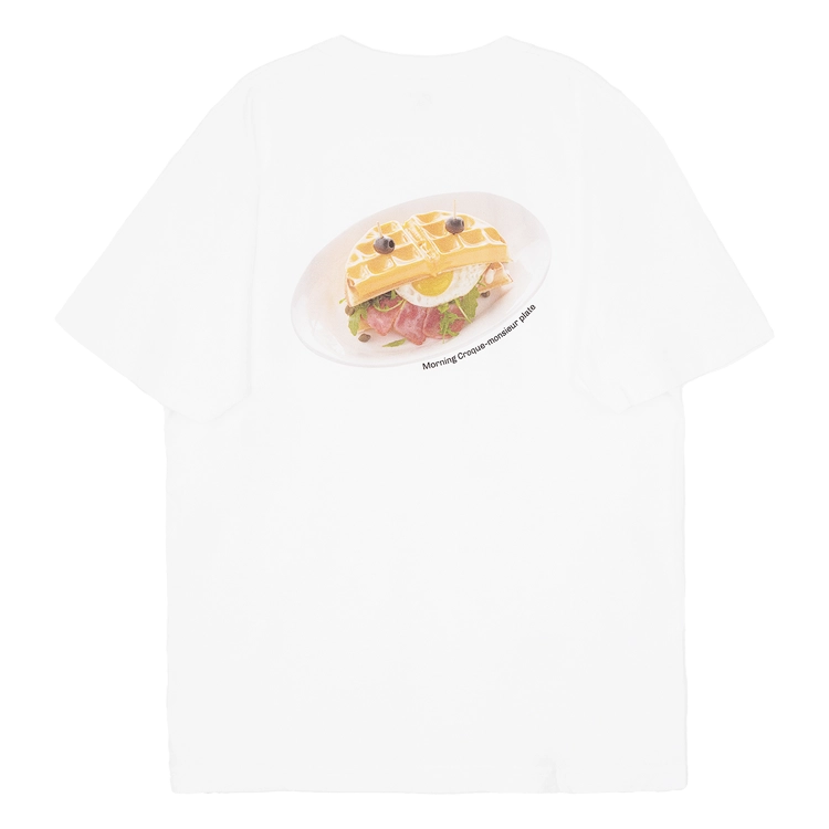 레이크앤마운틴 시그니처 메뉴 'Morning croque-monsieur plate'가 프링팅된 100% 면소재의 티셔츠입니다. .